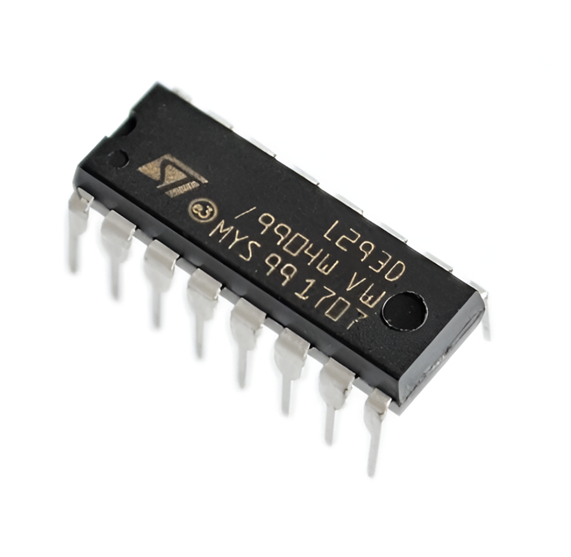 El integrado L293D driver puente H permite controlar la dirección y velocidad de hasta dos motores DC o un motor paso a paso bipolar mediante señales lógicas TTL. Integra diodos de protección internos contra tensiones inductivas y puede suministrar corriente continua de hasta 600 mA por canal. Es compatible con microcontroladores de 5 V, lo que facilita su integración en sistemas de control de movimiento y robótica.